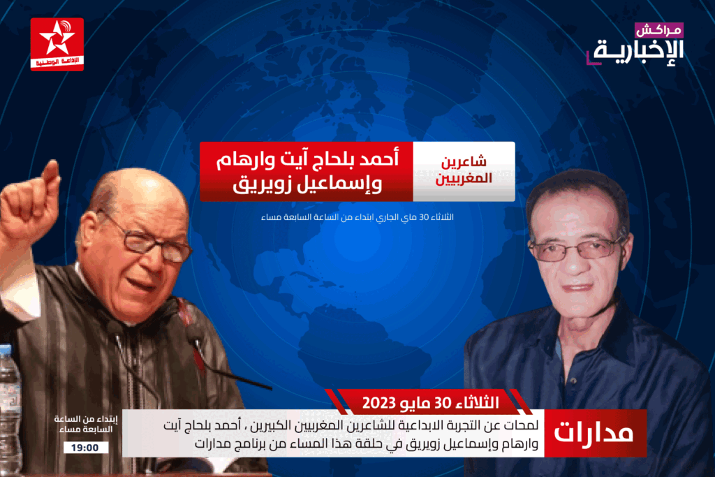 يخصص الاعلامي عبدالاله التهاني حلقة هذا الاسبوع من برنامج “مدارات”، على أمواج الاذاعة الوطنية من الرباط، لتقديم لمحات عن التجربة الابداعية للشاعرين المغربيين الكبيرين ، أحمد بلحاج آيت وارهام وإسماعيل زويريق ، واللذان أسهما بإنتاجاهما الغزير ودواوينهما العديدة ، في إغناء رصيد القصيدة المغربية المعاصرة ، سواء على مستوى الشعر العمودي أو الشعر المرسل ، مع حضور منتظم لهما في الساحة الادبية ، لازيد من خمسين عاما .
