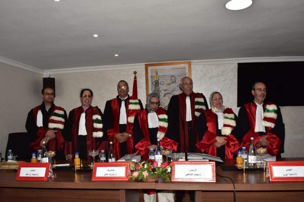 وتكونت لجنة المناقشة من الدكتور محمد الشافعي أستاذ التعليم العالي بجامعة القاضي عياض مراكش رئيسا ،والدكتور زكرياء خليل أستاذ التعليم العالي بجامعة القاضي عياض مراكش مشرفا،و الدكتورة حليمة بن حفو أستاذة التعليم العالي بجامعة بن زهر اكادير عضوة و مقررة ،والدكتور عادل عابد أستاذ التعليم العالي بجامعة القاضي عياض مراكش عضوا و الدكتورة نادية أيوب أستاذة التعليم العالي بجامعة القاضي عياض مراكش عضوة و مقررة الدكتور سليمان المقداد أستاذ التعليم العالي بجامعة القاضي عياض مراكش عضوا و مقررا.