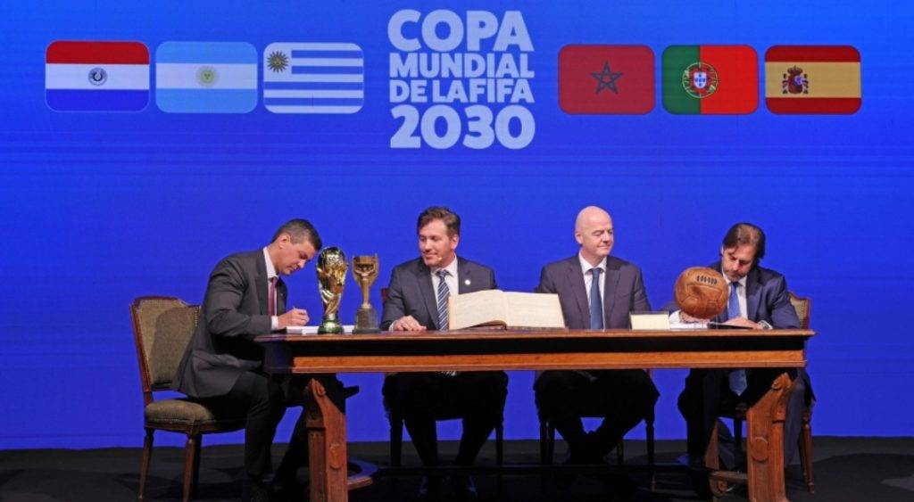 تم امس الخميس في مدينة لوكي الباراغوايانية التي تحتضن مقر اتحاد أمريكا الجنوبية لكرة القدم (كونميبول) التوقيع على الاتفاق الذي يضفي الطابع الرسمي على تنظيم المباريات الثلاث الأولى لكأس العالم 2030 في الأوروغواي والبارغواي والأرجنتين.