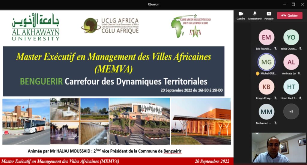قدم السيد الحجاج مساعيد النائب الثاني لرئيسة جماعة ابن جرير عشية يوم الثلاثاء 20 شتنبر 2022 محاضرة عن بعد حول موضوع ” الديناميكية الترابية لمدينة ابن جرير ” لفائدة طلاب الماجستير التنفيذي في إدارة المدن في إفريقيا (MEMVA) المشروع المشترك بين جامعة الأخوين في إفران (AUI) والمدن المتحدة والحكومات المحلية في إفريقيا (CGLU-AFRIQUE) .