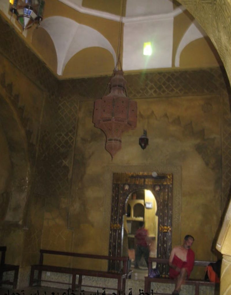 ويخترق هذه القباء التي يعمها من بخار الماء ضباب كثيف يلف الأجساد العارية الممططة والممددة على أرض تدب سخونتها مع الدم في العروق والأوصال، قنوات كالأوردة والشرايين تنقل الماء فائرا وباردا تضخه عذبا زلالا من صنابير نحاسية وتَعُبُّ منه ترعة كالصوان في القبو العميق (تافضنا) تخزن الماء الساخن الذي ينهل منه المستحمون اتقاء الازدحام على الصنابير التي لا تكون الضرورة تدعو إلى ملء الدلاء منها سوى عند الحاجة للوضوء.