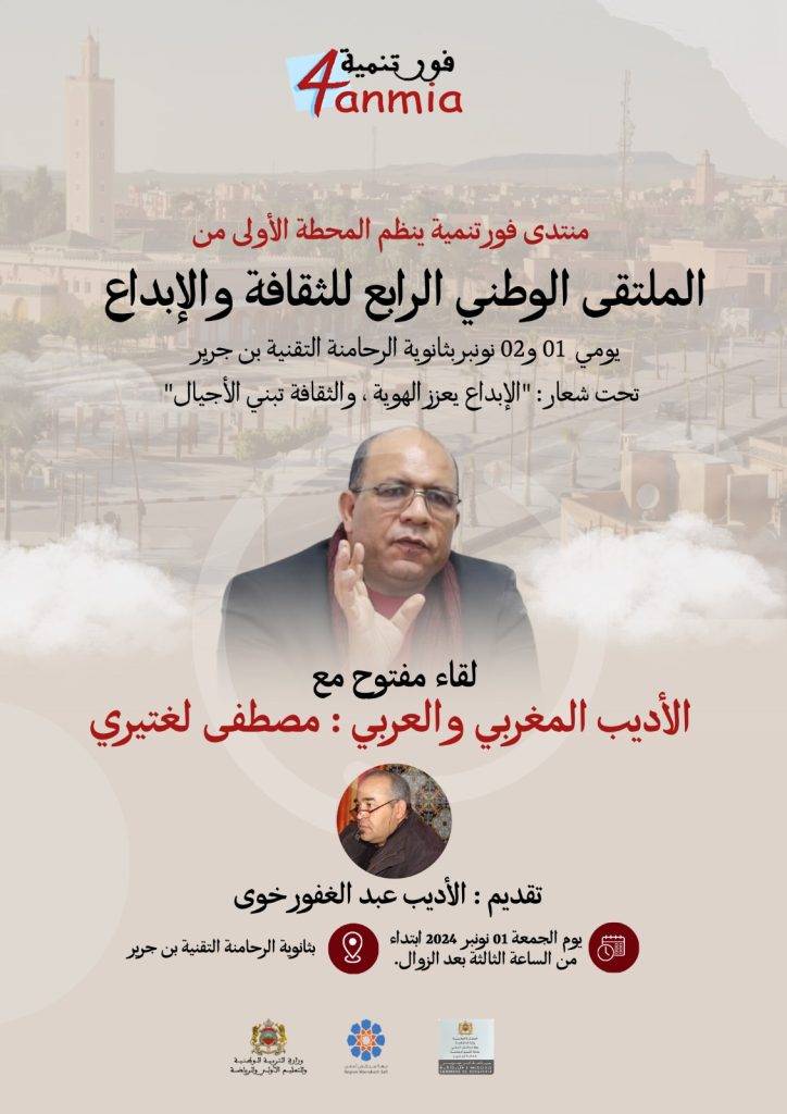 في إطار النسخة الرابعة للملتقى الوطني للثقافة والإبداع، يُنظم منتدى فور تنمية لقاء أدبي مميز يستضيف الروائي المغربي والعربي مصطفى لغتيري، وذلك يوم الجمعة فاتح نونبر بثانوية الرحامنة التقنية بمدينة بنجرير. يأتي هذا اللقاء تحت شعار “الإبداع يعزز الهوية، والثقافة تبني الأجيال”، ويهدف إلى تعزيز الحس الأدبي والفكري لدى الشباب.