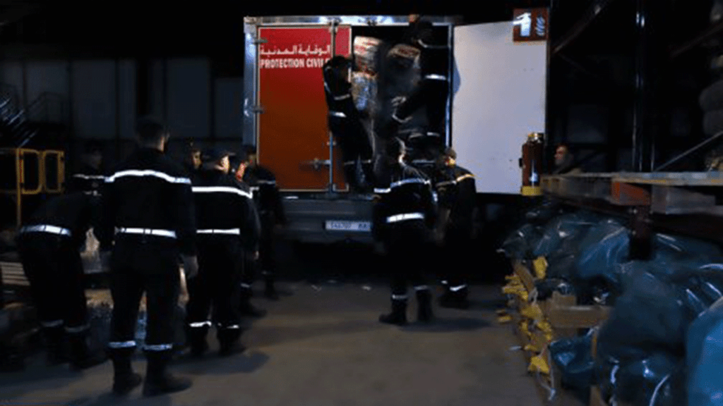 وعمل فريق من عناصر الوقاية المدنية، في الساعات الأولى من صباح اليوم السبت، وبسرعة فائقة، على تحميل الشاحنات من أجل إيصال المساعدات في أسرع وقت ممكن إلى السكان المتضررين من الزلزال.