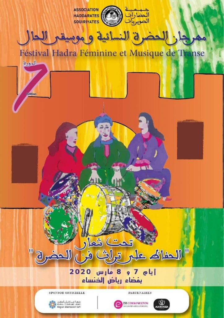 احتفاءا باليوم العالمي للمراة تنطلق بمدينة الصويرة برياض الخنساء فعاليات الدورة السابعة من المهرجان الدولي للحضرة ا لنسائية وموسيقى الحال تحت شعارالحفاظ على فن التراث ابتداءا من سابع مارس الى غاية الثامن من الشهر، بحضور ثلة من الوجوه الفنية 2020 الجاري وعشاق فن الحضرة.