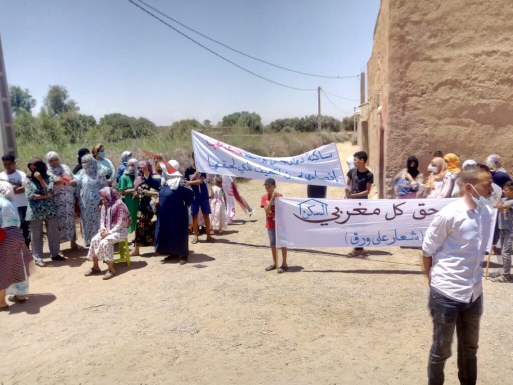 “لا للطرد، لا للتشرد. عاش جلالة الملك، بغينا لجنة تبحث في القضية”، نظم صبيحة اليوم الثلاثاء 29 يونيو الجاري، مجموعة من ساكنة دوار الجنان التابع ترابيا لجماعة أكفاي ضمنهم نساءا وأطفالا، وقفة احتجاجية بالدوار المذكور، احتجاجا على ما أسموه بالحيف الذي تعرضوا له بعد استصدار حكم قضائي يقضي بالإفراغ ضد حوالي 11 عائلة من مساكنهم، التي بنيت على أرض تعود ملكيتها لأحد السيدات المسماة “لطيفة، ..”، والتي تعتبرهم -لطيفة- محتلين لأرضها التي تتواجد عليها مساكنهم.