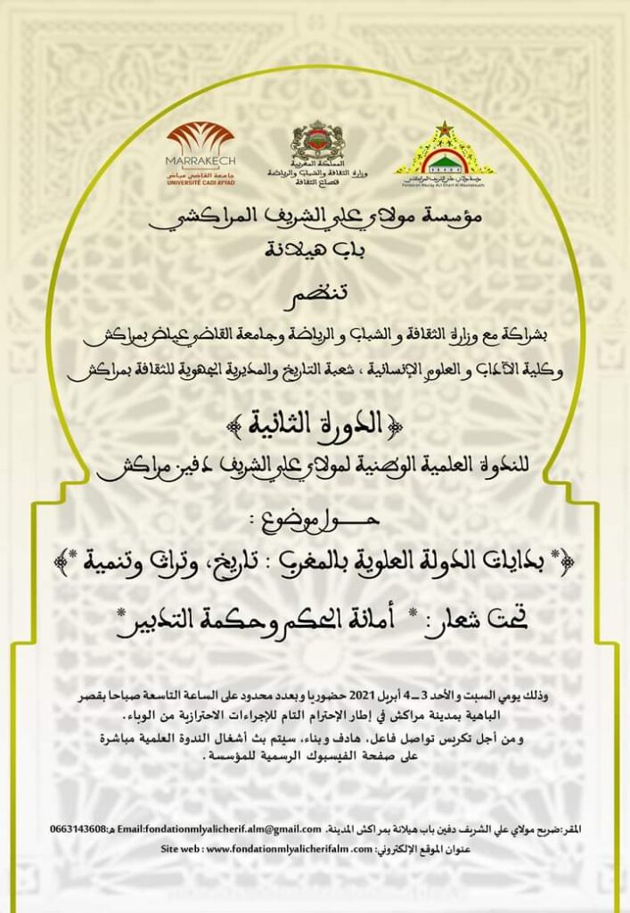 تنظم مؤسسة مولاي علي الشريف ندوتها السنوية الكبرى تحت شعار: ” أمانة الحكم وحكمة التدبير” حول موضوع “بدايات الدولة العلوية بالمغرب – تاريخ وتراث وتنمية” وذلك يومي 3 و4 أبريل 2021.