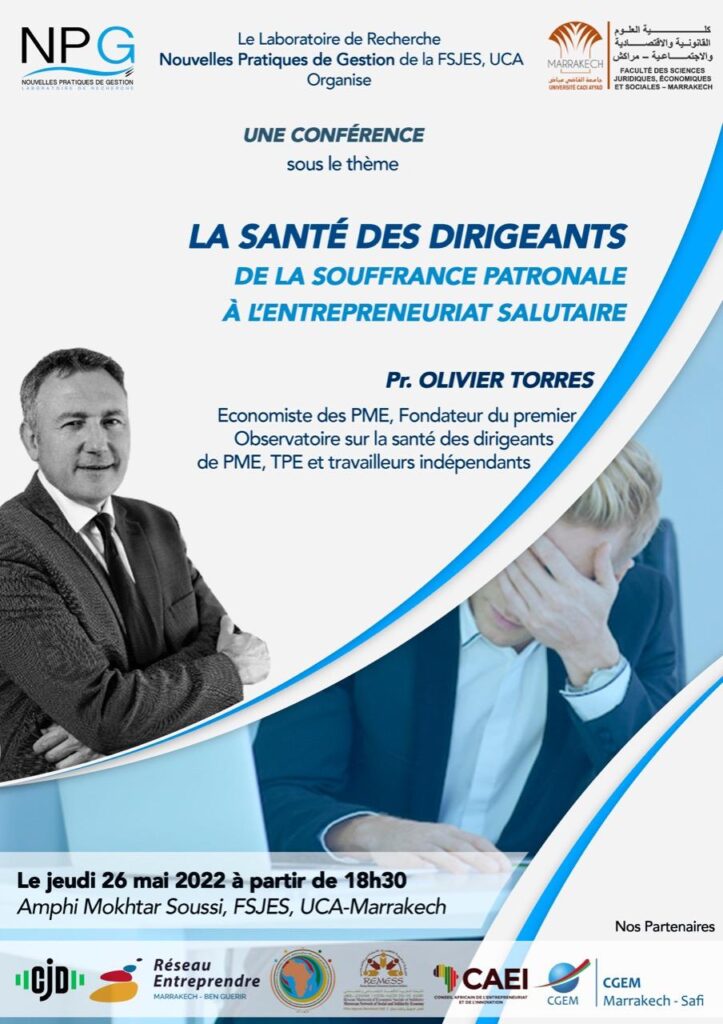 يلقي البروفيسور أوليفييه توريس Olivier TORRES لأول مرة في المغرب محاضرة حول موضوع: صحة المسير بين استراتيجية المقاولة الصغرى والمتوسطة وأدائها الاقتصادي. وذلك في رحاب كلية العلوم القانونية والاقتصادية والاجتماعية، جامعة القاضي عياض بمراكش يوم الخميس 26 ماي 2022 على الساعة السادسة والنصف مساء.