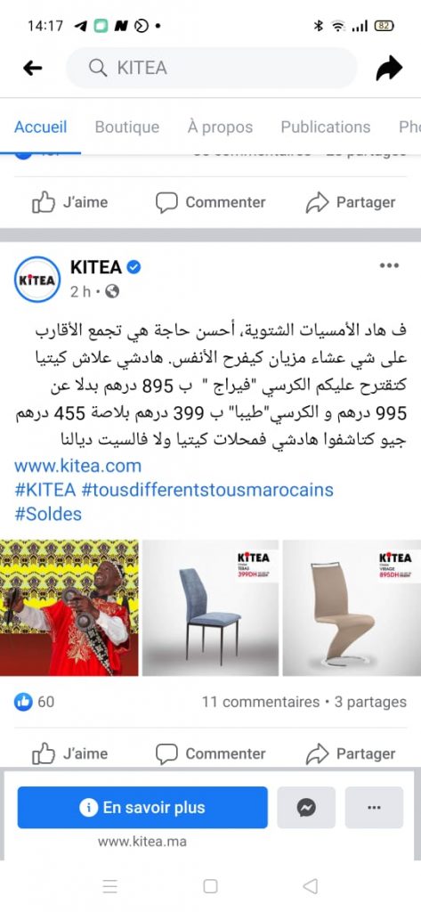 وضعت شركة كيتيا، عبر موقعها الإلكتروني وصفحاتها الرسمية بمواقع التواصل الاجتماعي، إعلانا ترويجيا، تدعو من خلاله المواطنين إلى الإقبال على عرضها الجديد من أجل شراء كراسي بأثمنة منخفضة عوض أثمنتها السابقة.