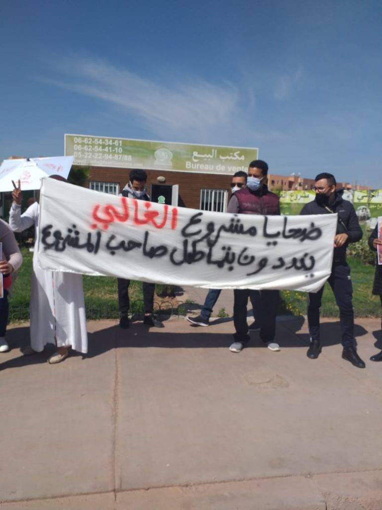 نظم ضحايا المشروع السكني الغالي الكائن بحي المسيرة بتراب مقاطعة المنارة، صباح اليوم السبت وقفة احتجاجية، للتنديد بفشل جميع الجهات المسؤولة في حل مشكلهم القائم مع صاحب المشروع.