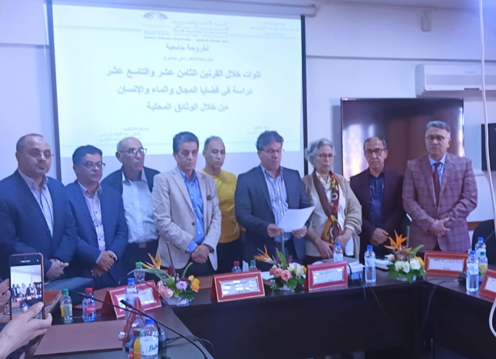 في إطار مشروعهم الهام حول “الماء في تاريخ المغرب”، واصل رواد “مختبر المغرب والحوض الغربي للبحر الأبيض المتوسط: التاريخ، التراث والموارد” سلسلة مناقشة أطاريحه حول تاريخ تدبير هذه المادة الحيوية بمختلف المجالات المغربية. حيث كان المهتمون بالموضوع، في علاقته بتاريخ المغرب بشكل عام، على موعد صباح أمس الجمعة 11 نونبر 2022، ابتداء من الساعة التاسعة صباحا، بقاعة المناقشات برحاب كلية العلوم الإنسانية بمراكش، على موعد مع مناقشة أطروحة دكتوراه شيقة حول “تلوات خلال القرنين الثامن عشر والتاسع عشر: دراسة في قضايا المجال والماء والإنسان من خلال الوثائق المحلية”… أعدها الطالب الباحث.. “حمزة أيت الحسين”، بإشراف مشترك بين الأستاذ الدكتور عبد اللطيف البرينسي والأستاذ الدكتور توفيق محمد القبايبي…، دافع عنها في حضرة لجنة علمية تحت رئاسة الدكتور عبد الخالقي محمد، أستاذ علم الاجتماع بذات الكلية، والسادة الأساتذة الدكاترة محمد الخداري وهشام الرگيگ وسيدي محمد ألعيوض أعضاء مقررين.