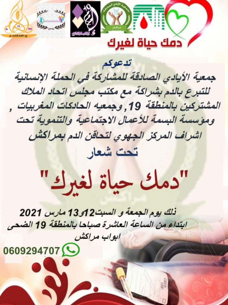 استجابة للطلب المتزايد على أكياس الدم وتلبية لنداء المركز الجهوي لتحاقن الدم بمراكش عبر سلسلة من البرامج الإذاعية والإعلانات بادرت إقامة جوهرة أبواب مراكش الضحى لتنظيم حملة للتبرع بالدم تحت شعار”دمك حياة لغيرك” بتنسيق مع المركز الجهوي لتحاقن الدم بمراكش أيام 12و13 مارس 2021 ابتداء من الساعة العاشرة صباحا بمقر الإقامة هذه المبادرة الإنسانية ثم تنظيمها من طرف جمعية الأيادي الصادقة بشراكة مع مجلس اتحاد الملاك المشتركين بالمنطقة 19 وجمعية الحادكات المغربيات ومؤسسة الأعمال الاجتماعية والتنمية وقد عرفت هذه الحملة تنظيما محكما مع احترام البروتوكول الصحي المعتمد لدى وزارة الصحة والداخلية وعرفت إقبالا من طرف المتبرعين للإشارة فمعدل التبرع بالدم بالمغرب لازال ضعيفا مما يجعل مخزون الدم يعرف خصاصا مهولا بسبب الطلب الكثير سواء من طرف المؤسسات الاستشفائية العمومية والخاصة