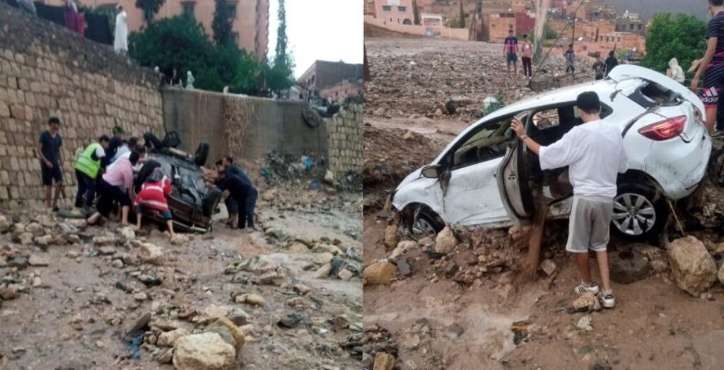 وجرفت السيول مجموعة من السيارات، بمنطقة آسني على الطريق الرابطة بين مولاي ابراهيم وتحناوت وألحقت أضرارا بمحلات تجارية ومقاهي بالمنطقة، حسب ما أظهرته مقاطع الفيديو المتداولة.