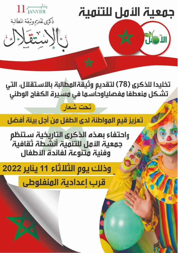 تنظم جمعية الأمل للتنمية نشاطا تربويا إحياء للذكرى 78 لتقديم وثيقة المطالبة بالاستقلال التي تصادف 11 يناير من كل سنة، وذلك تحت شعار “تعزيز قيم المواطنة لدى الطفل من أجل بيئة أفضل”.