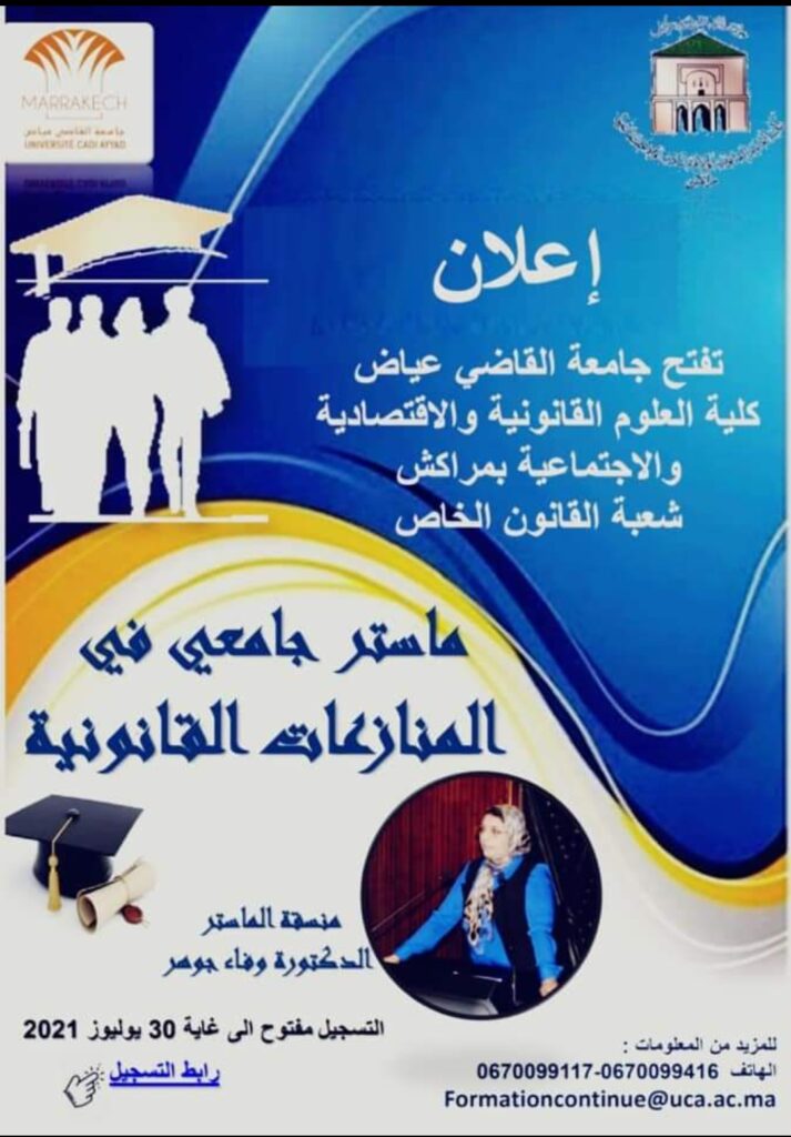 أعلن مركز التكوين المستمر التابع لجامعة القاضي عياض بمراكش عن افتتاح ماستر جامعي خاص في الدراسات القانونية تخصص “المنازعات القانونية” بكلية العلوم القانونية والاقتصادية والاجتماعية بمراكش، وتبلغ تكلفة التسجيل فيه 45000 درهم، ويفتح في وجه حاملي الإجازة أو ما يعادلها في القانون العام أو الخاص بالعربية أو الفرنسية.