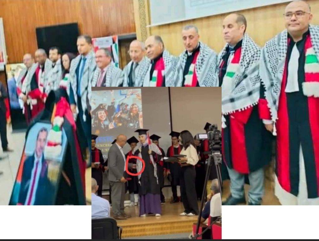 ويشار أن رئيس وعمداء جامعة القاضي عياض بمراكش، قد قاموا يوم الجمعة الماضي، بالتفاتة إنسانية حازت إشادة الجميع، وذلك بمناقشة أطروحة الدكتوراه لطالب فلسطيني وافته المنية قبل موعد المناقشة بأيام، حيث تم إرتداء الكوفية تضامنا معه ومع الشعب الفلسطيني.