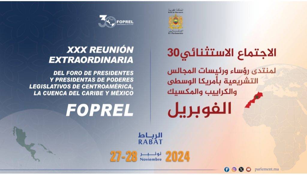 يحتضن البرلمان المغربي يومي 27 و 28 نونبر 2024 بمقر البرلمان بالرباط، الاجتماع الاستثنائي ال30 لمنتدى رؤساء ورئيسات المؤسسات التشريعية بأمريكا الوسطى والكراييب والمكسيك (الفوبريل).