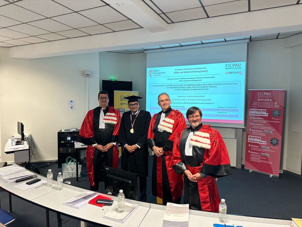 حصل الأسبوع الماضي ، الطالب الباحث، الأستاذ حسن بولعوان خبير مالي بمراكش، على دكتوراه في موضوع فشل المقاولات الجديدة في اٍدارة الأعمال من جامعة Eklore-ed School of management École ESC Pau بفرنسا بميزة مشرف جدا وتوصية بالنشر، وتهنئة من التحكيم.