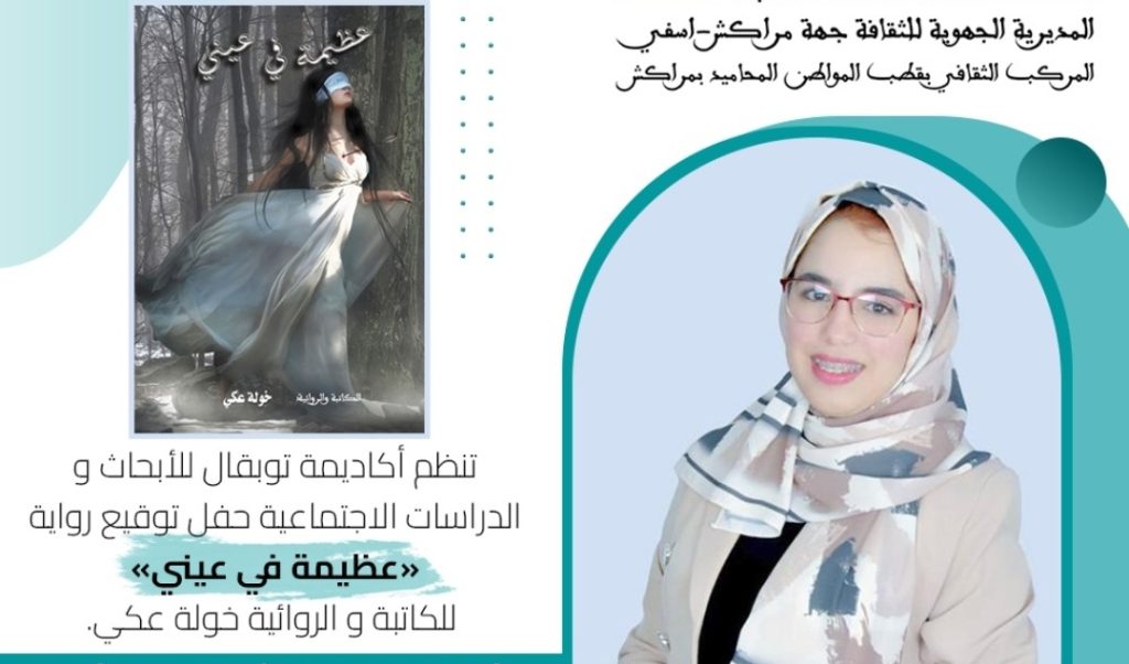تنظم أكاديمية توبقال للأبحاث والدراسات الاجتماعية يوم الاحد القادم 10 دجنبر، حفل توقيع رواية “عظيمة في عيني” للكاتبة والروائية خولة عكي.
