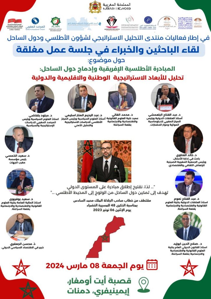 في إطار فعاليات منتدى التحليل الاستراتيجي لشؤون الأطلسي ودول الساحل،تحتضن قصبة ايت اومغار ايمينيفري بمدينة دمنات،يوم الجمعة 8مارس الجاري، فعاليات لقاء الباحثين والخبراء في جلسة عمل مغلقة،حول موضوع:”المبادرة الأطلسية الافريقية،وادماج دول الساحل :تحليل الابعاد الاستراتيجية الوطنية والاقليمية والدولية”من تنشيط نخبة من الدكاترة والأساتذة الباحثين والخبراء الاكاديميين من ذوي الاختصاص