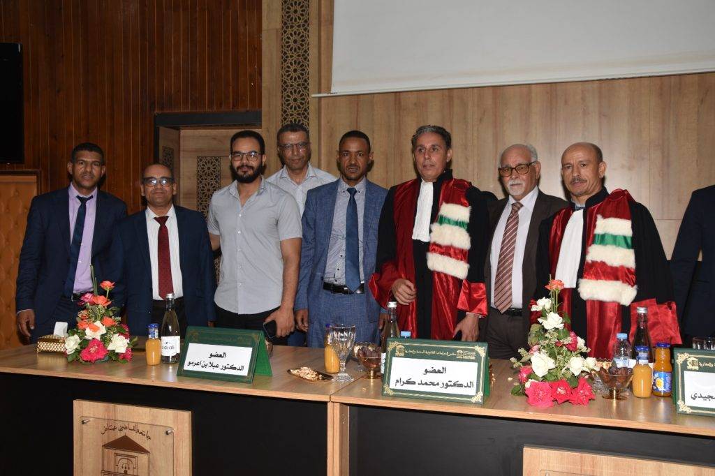 الدكتورة السعدية مجيدي أستاذة التعليم العالي بجامعة القاضي عياض رئيسة، والدكتور محمد مومن أستاذ التعليم العالي بجامعة القاضي عياض مشرفا، والدكتور محمد كرم أستاذ التعليم العالي بجامعة القاضي عياض مراكش عضوا و مقررا، و الدكتور عبلا بن اعرموا أستاذ التعليم العالي بجامعة بن زهر اكادير عضوا و مقررا الدكتور، وعبد الهادي النجار أستاذ مؤهل بكلية العلوم القانونية و الاقتصادية و الاجتماعية بمراكش عضوا و مقررا.