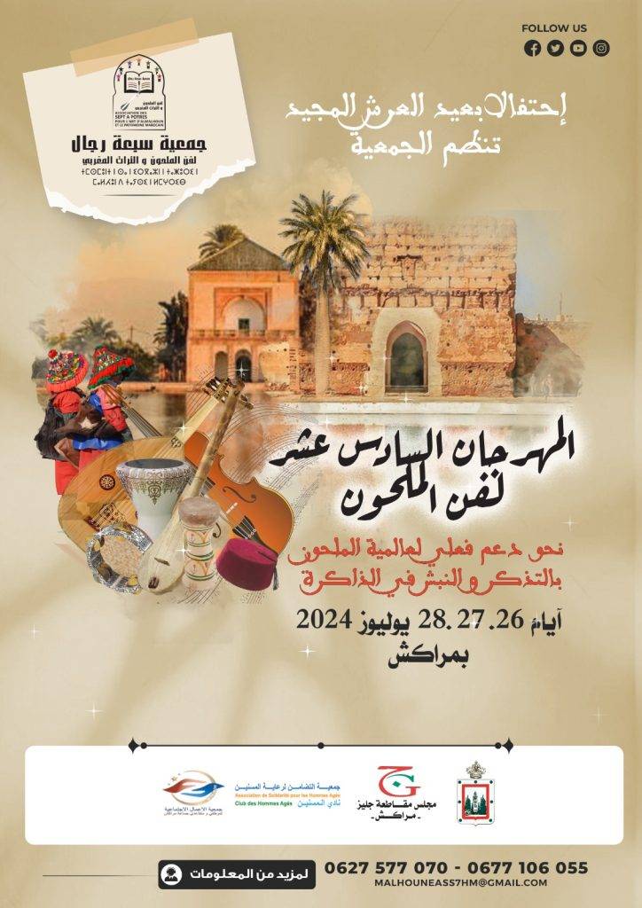 اعلنت جمعية “سبعة رجال لفن الملحون والتراث المغربي” في بلاغ توصلت به”مراكش الإخبارية” عن تنظيم الدورة السادسة عشر لمهرجان الملحون تحت شعار “نحو دعم فعلي لعالمية الملحون بالتذكر والنبش في الذاكرة”، وذلك خلال أيام 26 و27 و28 يوليوز 2024 في فضاءات مختلفة داخل جهة مراكش. ستحتفل الدورة الجديدة بفن الملحون كتراث عالمي غير مادي معترف به لدى منظمة اليونسكو، كما تحتفي بمدينة مراكش باعتبارها عاصمة الثقافة في العالم الإسلامي بحسب منظمة الإيسيسكو، وبحضور باحثين مختصين في فن الملحون على المستوى الوطني.