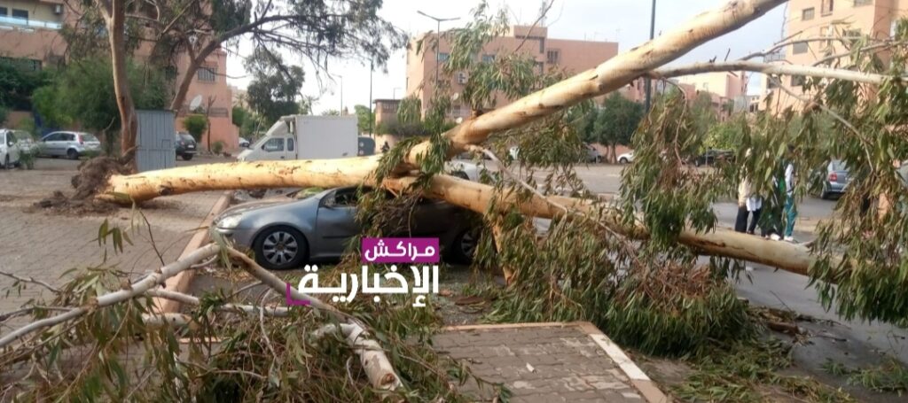 وحسب ما توصل به موقع “مراكش7″، فلم يتم لحدود كتابة هاته الأسطر التدخل من أجل إزالة الشجرة التي هوت فوق رأس شخص، وكذا سيارة رباعية الدفع، بفعل عاصفة الرياح القوية التي ضربت المدينة الحمراء على بعد دقائق قليلة من صافرة بداية المباراة بين المنتخب الوطني والمنتخب الفرنسي، وهو ما يعرقل حركة السير.