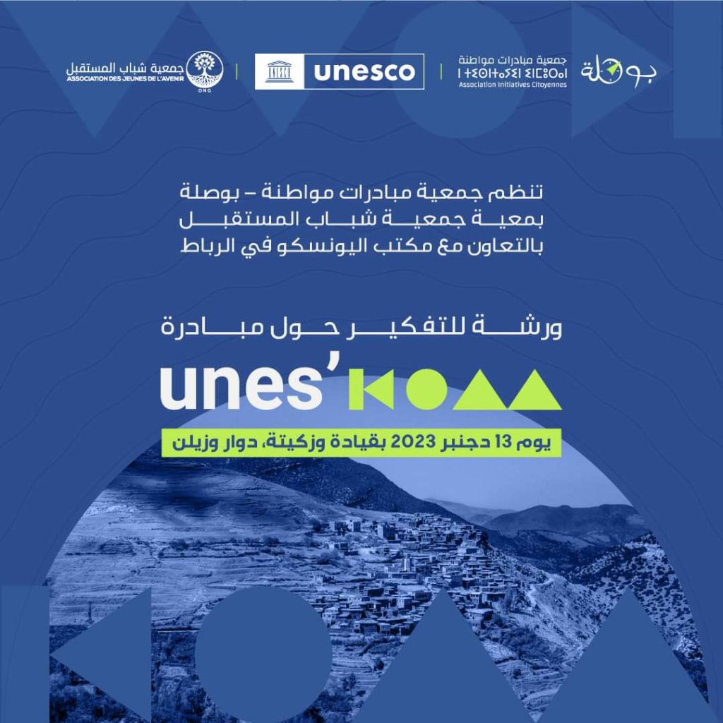 وتنظم هذه الورشة جمعية مبادرات مواطنة – بوصلة بشراكة مع جمعية شباب المستقبل، وبالتعاون مع مكتب اليونسكو بالرباط، حول موضوع “انواع المعلومات والمواضيع التي تحتاج لها عملية دعم السياسات العمومية الخاص بالإعمار ” وذلك في إطار مبادرة unes’KOM .