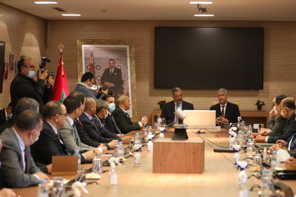 ترأس وزير الفلاحة والصيد البحري والتنمية القروية والمياه والغابات، يوم الثلاثاء 22 فبراير 2022 بالرباط، لقاء مع رئيس جامعة الغرف الفلاحية السيد الحبيب بنطالب ورؤساء الغرف الفلاحية الاثني عشر وكذا رؤساء الهيئات البيمهنية الفلاحية التي تمثل الكونفدرالية المغربية للفلاحة والتنمية القروية، بحضور رئيس مجموعة القرض الفلاحي للمغرب السيد طارق السجلماسي ومسؤولين مركزيين وجهويين من قطاع الفلاحة.