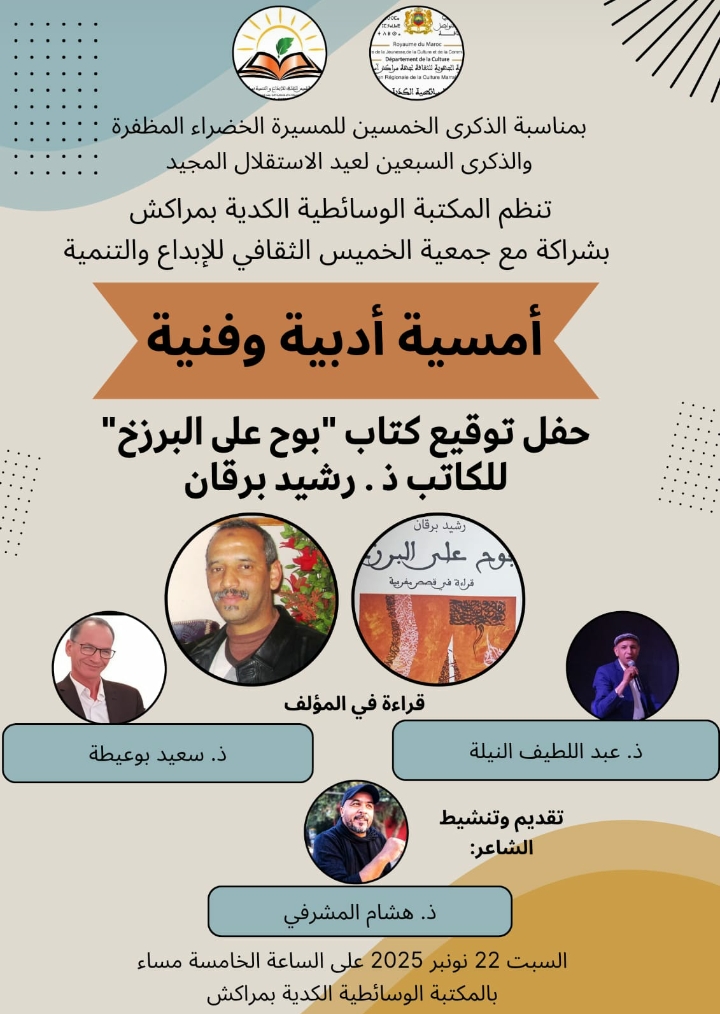 المكتبة الوسائطية الكدية تحتفي بالقصيد والموسيقى في أمسية أدبية وفنية ثقافة وفن المكتبة الوسائطية الكدية تحتفي بالقصيد والموسيقى في أمسية أدبية وفنية سارة بوصبع 2025-11-21 00:01 تستعد المكتبة الوسائطية الكدية بمراكش لتنظيم أمسية أدبية وفنية، يوم السبت 22 نونبر الجاري ابتداء من الساعة الخامسة مساء بقاعة الندوات في إطار...اقرأ المزيد