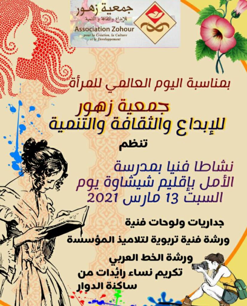 بمناسبة اليوم العالمي للمرأة ومن أجل تشجيع التلاميذ بالوسط القروي على التمدرس والنجاح و احتفالا بالمرأة القروية بادرت جمعية زهور للإبداع والثقافة والتنمية بمناسبة اليوم العالمي للمرأة إلى تنظيم صبحية ترفيهية وفنية وثقافية تضمنت تجميل فضاء مركزية مجموعة مدارس الأمل بمديرية شيشاوة وتنظيم ورشة فنية تربوية لتلاميذ المؤسسة وورشة في فن الخط العربي مع تنظيم حفل تكريم نساء رائدات بدوار لكناسيس مقر المركزية وقد كان في استقبالهم مدير المؤسسة الأستاذ خالد زغلول مرفوقا بالطاقم التربوي للمؤسسة وقد أدخلت هذه المبادرة الفرح والسرور على محيا التلميذات والتلاميذ وكذالك على المرأة القروية التي تلعب دورا أساسياً في استقرار الأسرة وتربية الأطفال وغرس القيم النبيلة والحفاظ على عادات وتقاليد المجتمع القروي بجماعة لمزوضية التابعة لإقليم شيشاوة