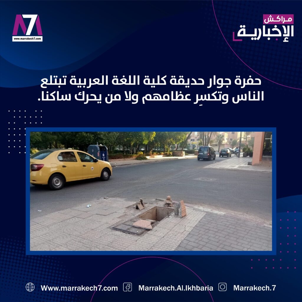 في الدول التي تقدِر الإنسان تقديرا لن ترى هذه الصور المهينة، والتي تعكس قيمة المواطن عند مدبري الشأن العام، فكيف يعقل أن تظل هذه الحفرة غير مغطاة من ايام متروكة لاصطياد ضحاياها وسط شارع الفاسي وأمام حديقة كلية اللغة العربية دون أي تحرك ، مؤسف جدا ما بلغه ضمير المسؤولين بالمدينة ، بالأمس كانت إحدى الطالبات ضحية الحفرة ، واليوم نجت سيدة أخرى بأعجوبة رغم العلامات التي تطوع المواطنون لوضعها حتى ينتبه المارة ، فمتى سيتم التدخل ، ولماذا لا يتم زجر شركات الاتصالات التي تركت الحفرة على ما عليها بعد أن انتهت من أشغالها؟