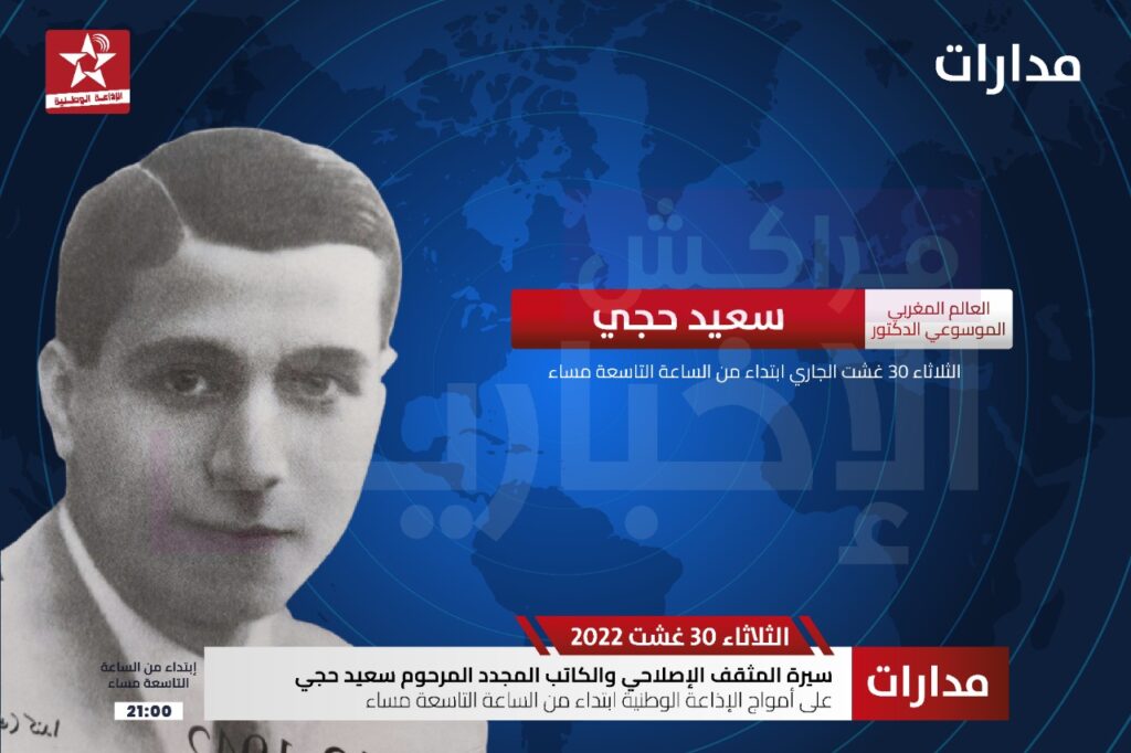 يلتقي مستمعو الاذاعة الوطنية من الرباط ، مساء يومه الثلاثاء 30 غشت ، في الساعة التاسعة مساء ، مع حلقة جديدة من البرنامج الادبي والفكري “مدارات” ، يخصصها الاعلامي عبدالاله التهاني ، لالقاء الضوء على سيرة وحياة المرحوم سعيد حجي ، الذي يعتبر أحد الاعلام الكبار المساهمين في التأسيس للنهضة المغربية الحديثة ، وأحد الرواد الذين أرسوا الاسس الاولى للصحافة الوطنية المغربية، في فترة الثلاثينات والاربعينات ، من خلال إصداره لجريدة “المغرب” وملحقها الادبي ، كأول يومية مغربية وطنية ، وكذا إصداره لمجلة “الثقافة المغربية” ، كمنبر مخصص للقضايا الفكرية ، الامر الذي جعل منه نموذجا للمثقف الاصلاحي المتنور ، الذي عمل في واجهات عدة ، وتميز بين أبناء جيله بعطاء زاخر ، لم يضاهيه فيه غيره ، رغم حياته القصيرة التي لم تتجاوز ثلاثين سنة.