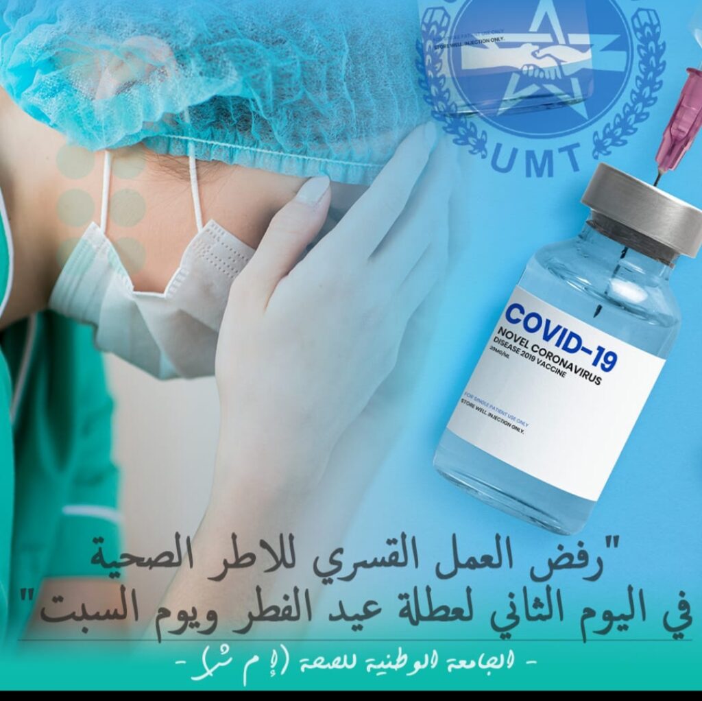 رفضت شغيلة قطاع الصحة، المنضوية تحت لواء الجامعة الوطنية للصحة (إ م ش)، عدم الالتحاق الى مراكز التلقيح خلال اليوم الثاني من عطلة عيد الفطر.