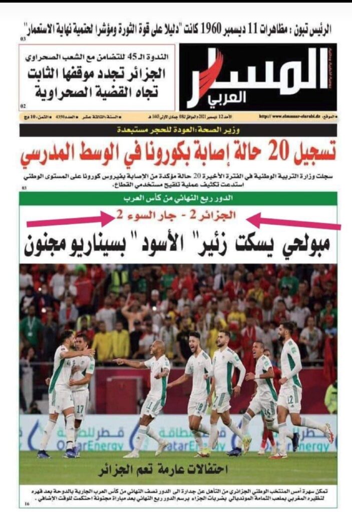 وفيما يفترض الشعبان الأخوان ولاسيما جمهورهما الرياضي أن تبث الروح الرياضية التي سادت في مقابلة المغرب والجزائر السبت الماضي من أنفاسها في حكام البلدين الجارين وساستهما للعبور إلى مرحلة نهائي الخلاف وطي أدوار الصراع التمهيدي لحرب طاحنة، انتبدت الجرائد ركن الخلاف واقتعدت على الجمر تطلق شرارات الحرائق التي تأتي على الأخضر واليابس لا تبقي ولا تذر