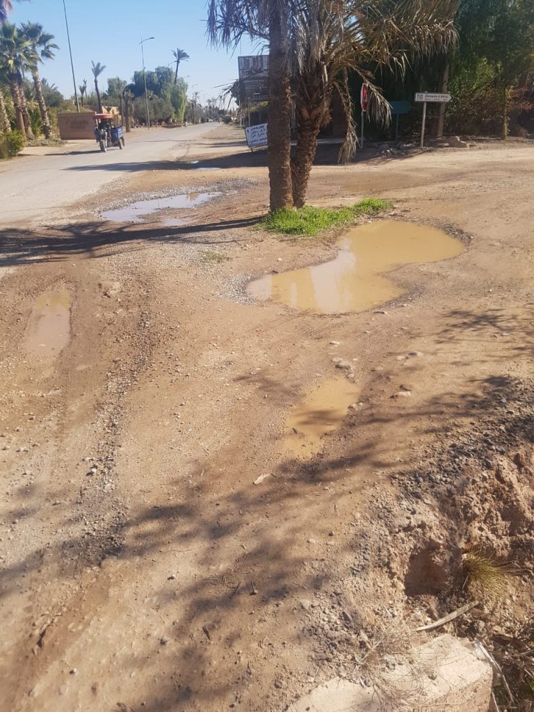 أهم طريق بمنطقة النخيل السياحية بامتياز على مستوى مدينة مراكش، هي في وضع كارثي وتتسبب في الضرر الكبير لأصحاب السيارات الخفيفة والدراجات النارية.