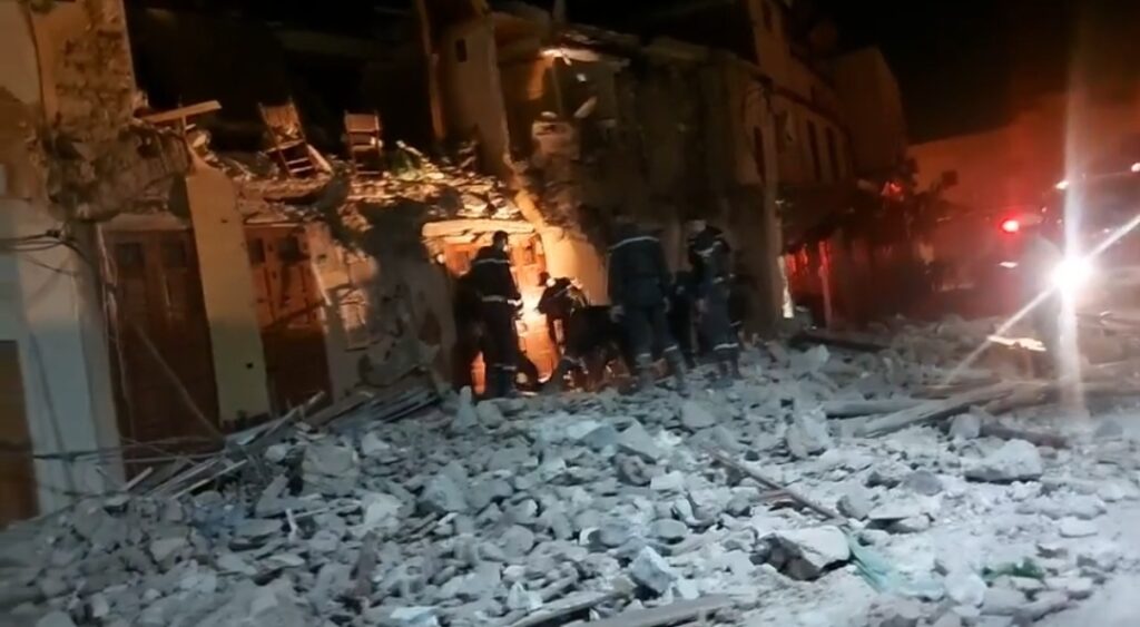 علم موقع “مراكش7″، أن منطقة باب فتوح بساحة جامع الفنا، تعيش في هذه الاثناء على وقع حالة من الاستنفار، جراء العثور على جتثين، بعد انهيار مقهى على إثر الهزة الأرضية التي ضربت مراكش ليلة أمس الجمعة.