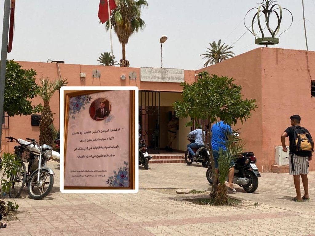 عندما تطأ أقدام المواطنين مدخل الملحقة الإدارية الداوديات، تثير انتباههم لوحة تتضمن صورة لصاحب الجلالة، مرفوقة بمقتطف من خطابه الى الأمة بمناسبة الذكرى 19 لعيد العرش المجيد، والذي جاء فيه “ان قضايا المواطن لا تقبل التأجيل ولا الانتظار، لانها لا ترتبط بفترة دون غيرها، والهيئات السياسية الجادة هي التي تقف الى جانب المواطنين في السراء والضراء”.
