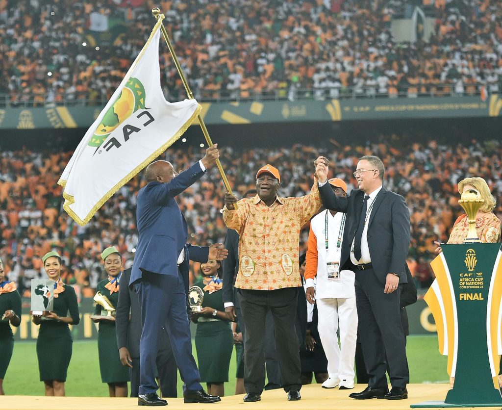 تسلم فوزي لقجع رئيس الجامعة الملكية المغربية لكرة القدم علم كأس افريقيا، الذي سينظم بالمغرب السنة المقبلة من رئيس الكوت ديفوار الحسن واتارا بمعية رئيس الاتحاد الافريقي لكرة القدم، باتريس موتسيبي ورئيس الفيفا جياني ايفانتينو.