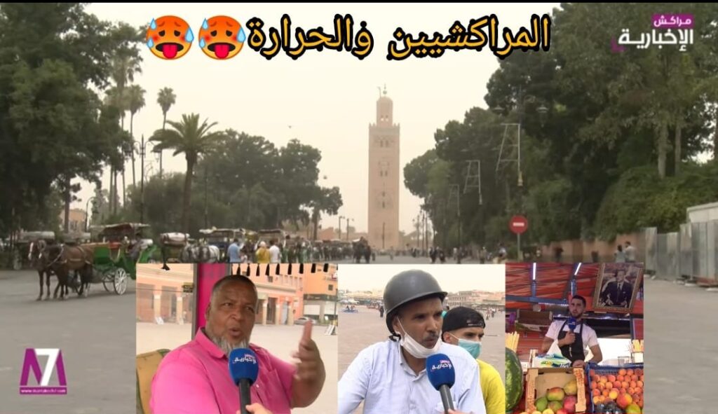 حرارة مفرطة تلك التي تشهدها مدينة مراكش في الأيام الأخيرة، حيث تتراوح حسب ما جاء في نشرة إنذارية للمديرية العامة للأرصاد الجوية ما بين 45 و50 درجة، وهو ما دفع طاقم مراكش الإخبارية للنزول إلى الشارع، لاستقصاء آراء المراكشيين بخصوص موجة الحرارة التي تشهدها المدينة في اليومين الاخيرين، لنتابع :.