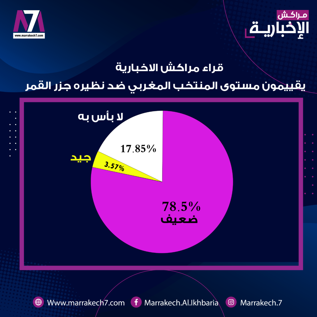أظهر استطلاع للرأي أجراه موقع مراكش7 مباشرة بعد نهاية المباراة التي جمعت المنتخب المغربي بنظيره جزر القمر مساء يوم أمس الجمعة 14 يناير لحساب الجولة الثانية من دور المجموعات من بطولة كأس أمم إفريقيا المقام بالكاميرون والتي انتهت لصالح كتيبة خاليلوزيتش بهدفين دون رد، (أظهر) أن 78.5% من القراء غير مقتنعين بالمستوى الفني الذي أبان عنه أسود الأطلس، وجاء من ضمن تعليقات متتبعي موقع مراكش7 عبر صفحته الرسمية لموقع التواصل الاجتماعي (فايسبوك) “لا علاقة دون المستوى.. منتخب ضعيف جدا” وعلق متتبع أخر “ضعيف وغير مقنع.. المنتخب منفوخ إعلاميا”