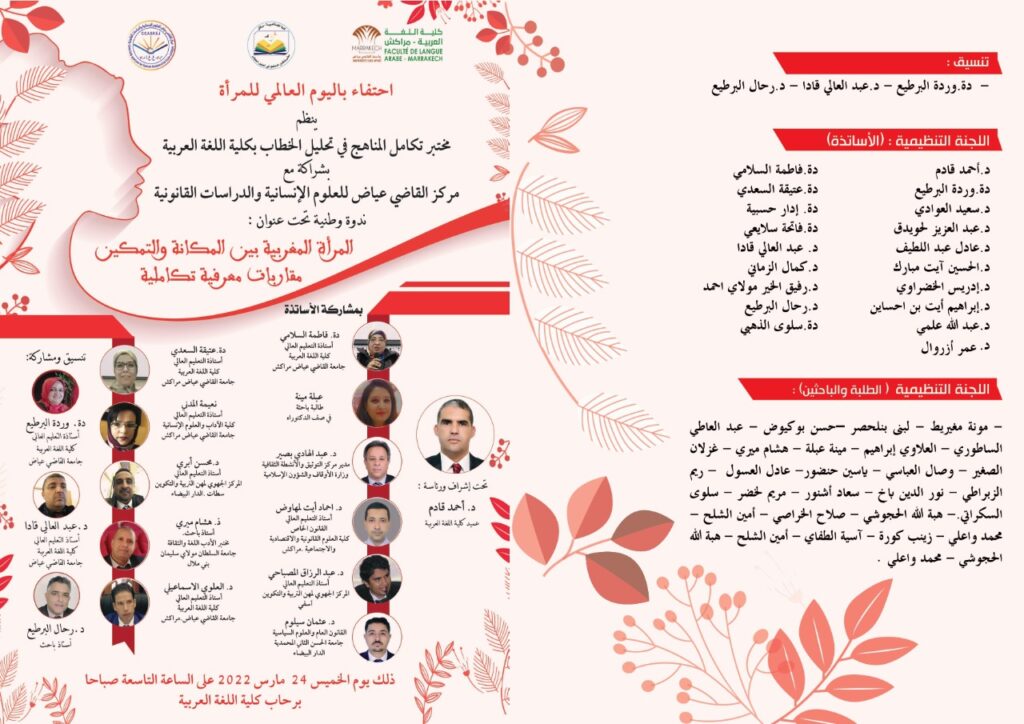 في سياق الاحتفال باليوم العالمي للمرأة، ينظم مختبر تكامل المناهج في تحليل الخطاب بكلية اللغة العربية بشراكة مع مركز القاضي عياض للعلوم الإنسانية والدرسات القانونية ندوة وطنية تحت عنوان ” المرأة المغربية بين المكانة والتمكين مقاربات معرفية تكاملية وذلك يوم غد الخميس 24 مارس 2022 ابتداء من الساعة التاسعة صباحا برحاب كلية اللغة العربية.