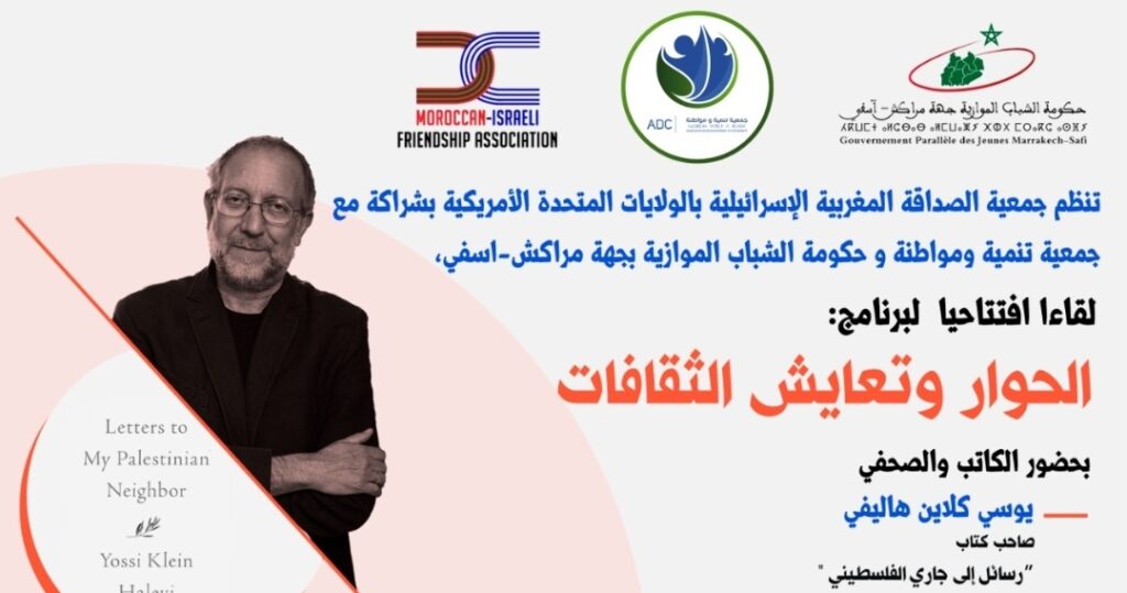تنظم جمعية الصداقة المغربية الإسرائيلية بالولايات المتحدة الأمريكية، بشراكة مع جمعية تنمية ومواطنة وحكومة الشباب الموازية بجهة مراكش أسفي، لقاء افتتاحيا لبرنامج “الحوار وتعايش الثقافات”، لتقديم أهدافه وإستراتيجيته، وتوقيع الشراكات مع الجمعيات المشاركة فيه، وذلك يوم الأحد 19 دجنبر الجاري بدار المنتخب بمراكش.