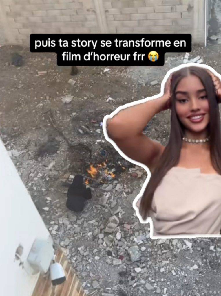 واظهر الفيديو الذي تجاوز سقف 16 مليون مشاهد على منصة التيكتوك من كافة بقاع العالم، سيدة ترتدي الحجاب الشرعي، والذي يحجب ملامحها، وهي تتربص بمنزل المؤثرة لتقوم بعدها بإشعال النار والقيام بحركات غريبة، لتتوجه بعدها مباشرة إلى باب المنزل، الشيء الذي اظهرته كاميرات المراقبة والتي استخدمتها هذه المؤثرة لتجعل الأمر يبدو أكتر واقعية.