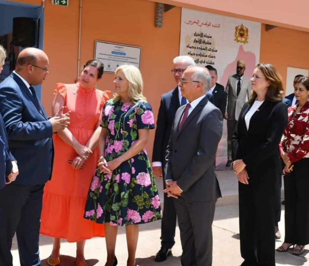 قامت السيدة الأولى للولايات المتحدة الأمريكية، جيل بايدن، صباح أمس الاثنين 5 يونيو الجاري، بزيارة للثانوية الإعدادية ابن العريف بسيدي يوسف بن علي والتي تحتضن مشاريع الميثاق الثاني لمشروع تحدي الألفية، وذلك في آخر محطة لها قبل من زيارتها للمملكة.