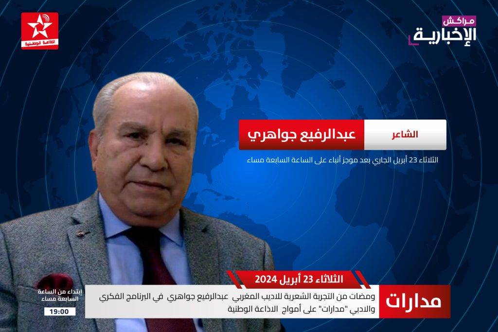 يلتقي مستمعو الاذاعة الوطنية من الرباط ، يومه الثلاثاء 23 أبريل الجاري مباشرة بعد موجز أنباء السابعة مساء ، حلقة جديدة من البرنامج الأدبي والفكري “مدارات” ، يخصصها الكاتب الإعلامي عبدالإله التهاني، لتقديم ومضات من التجربة الشعرية للاديب المغربي عبدالرفيع جواهري، ولوحات من أشعاره ، التي تحول جزء منها إلى أعمال غنائية خالدة ، حازت قبولا وانتشارا واسعين ، ولاسيما منها تلك التي كتبها منذ الستينيات ، وحتى مطلع تسعينيات القرن الماضي. ومعلوم أنه صدرت للشاعر عبدالرفيع جواهري ، سلسلة من دواوينه الشعرية ، من قبيل : ” وشم في الكف” – “شيىء كالظل” – “كأني أفيق” ، وديوان “الرابسوديا الزرقاء ” .