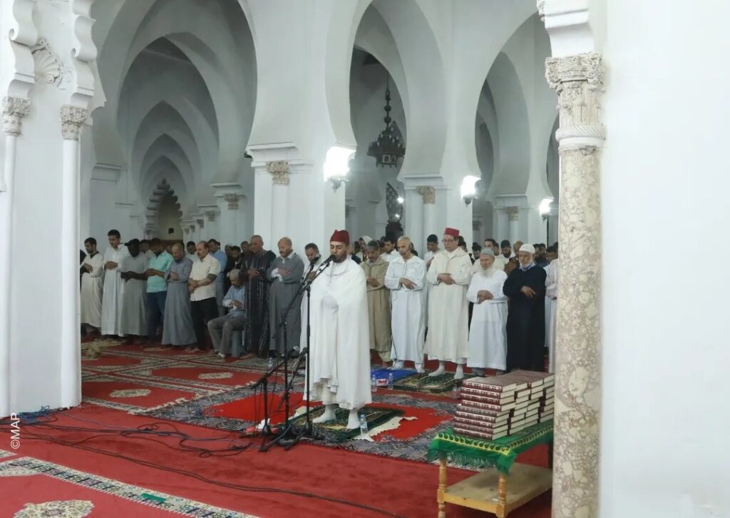 عشرات الدقائق قبيل صلاة العشاء يتوافد المصلون على جميع أبواب المسجد، ومن كافة الأعمار، شيبا، وشبابا ونساء وأطفالا، متأبطين سجاداتهم وفي أياديهم قنينات ماء، قبل أن تطالعهم تلك الأعمدة التي تؤثث القاعة الكبيرة الموجهة للصلاة، والتي تتوسط باحة هذا المكان الروحي الرفيع، الواقع على مقربة من ساحة جامع الفنا العريقة.
