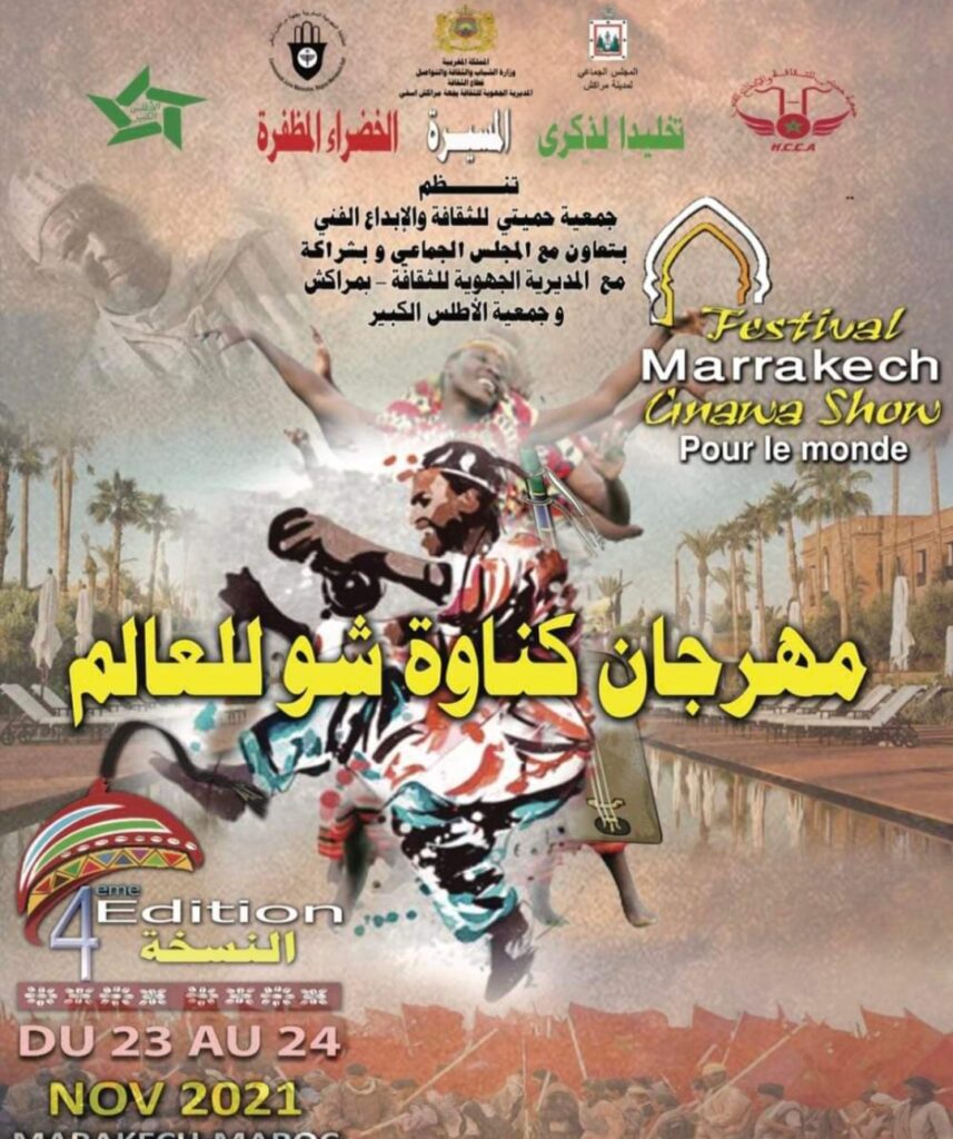 تحتضن مدينة مراكش بحر هذا الأسبوع مهرجان كناوة شو للعالم وذلك يومي 23/24 نونبر2021، تخليدا لذكرى المسيرة الخضراء المظفرة، المهرجان من تنظيم “جمعيتي للثقافة والابداع الفني بتعاون مع المجلس الجماعي وبشراكة مع المديرية الجهوية للثقافة وجمعية الأصلس الكبير.