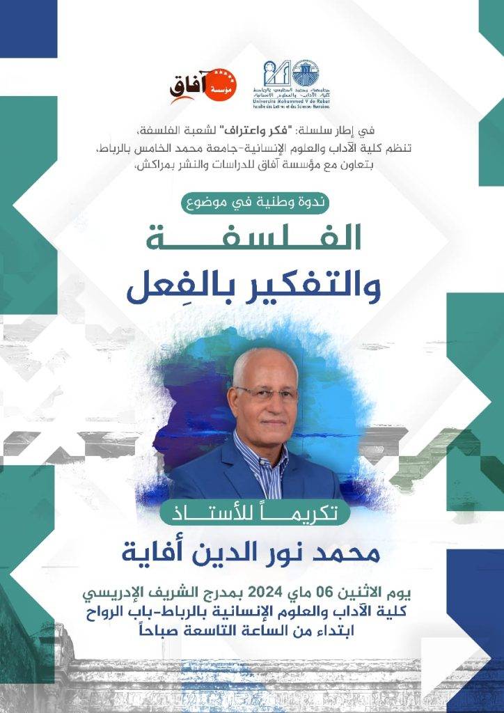 تنظم كلية الآداب والعلوم الإنسانية بجامعة محمد الخامس في الرباط ندوة فكرية وطنية حول أعمال وكتابات الأستاذ محمد نور الدين أفاية. تقام الندوة يوم الاثنين 6 مايو 2024، في مدرج الشريف الإدريسي بمقر الكلية في باب الرواح، ابتداءً من الساعة التاسعة صباحًا.