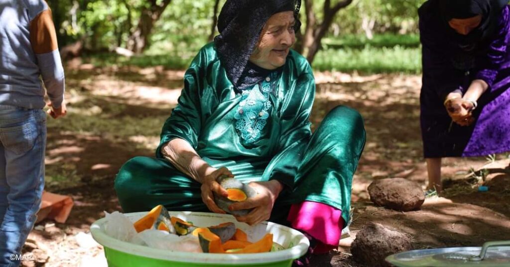 في ركن خلفي من هذا “المطبخ المفتوح على السماء”، وتحت شجرة وارفة الظلال، كانت “إيجة”، وهي سيدة يناهز عمرها 65 سنة، قد انتهت للتو من تقطيع الحطب لاستعماله في عملية الطهي.