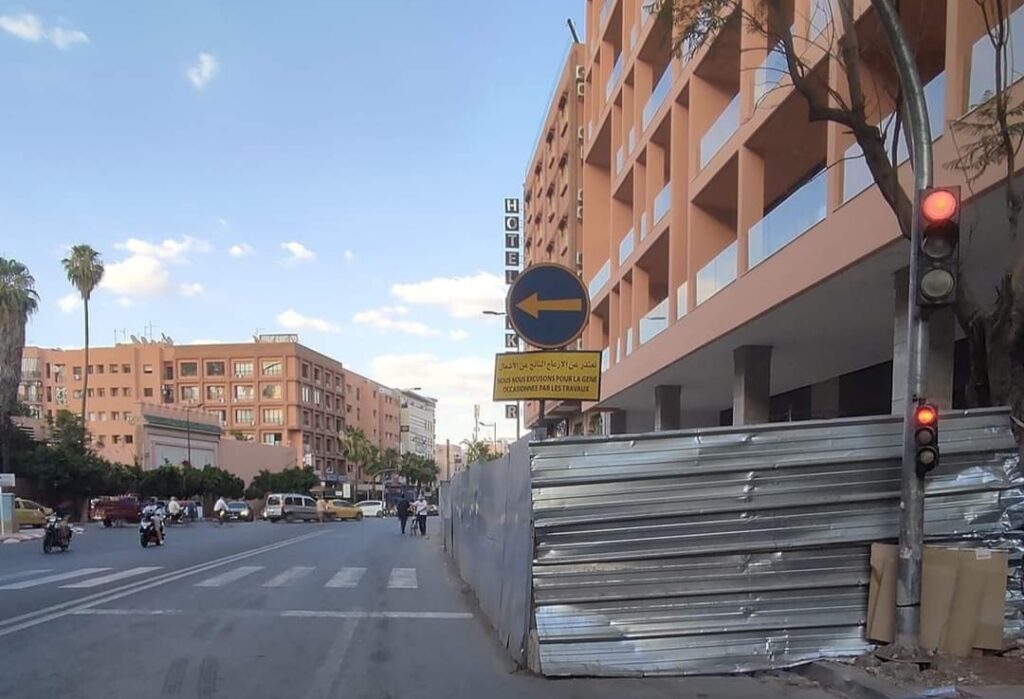 لا يزال ورش بناء عمارة عند نهاية شارع الزرقطوني وبداية شارع يعقوب المنصور، وسط حي جليز بمراكش، يشكل الكثير من الضرر لمستعملي الطريق من أصحاب السيارات والدراجات النارية وأيضا المواطنين من المارة.